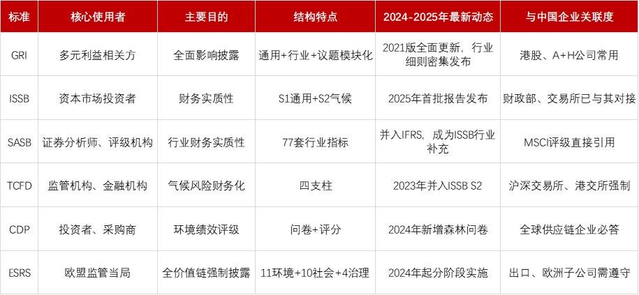 与第一部分的“鸟瞰式”扫描不同,这部分将用“显微镜”逐层透视这些标准在立法定位、披露边界、议题取舍、技术细节乃至未来演进上的差异与耦合。